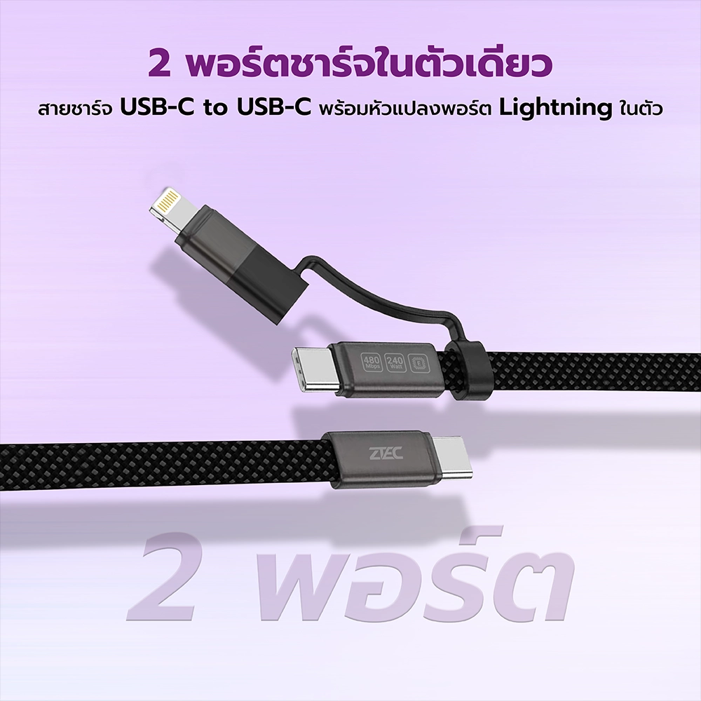 - 2 in 1 สายชาร์จ USB-C to USB-C พร้อมหัวแปลงพอร์ต Lightning